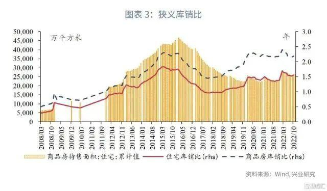 衡量住宅库存最狭义的口径是商品住宅待售面积,该指标是房地产开发企业报告期末已竣工的可供销售或出租的商品房屋建筑面积中,尚未销售或出租的商品房屋建筑面积。由于商品住宅待售面积计入的是已竣工的建筑面积,因此对应除以过去12个月住宅销售面积中的现房面积,作为狭义库销比。
