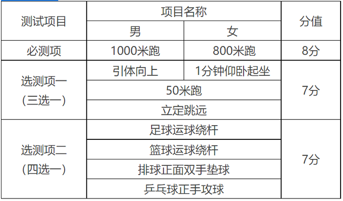 (四)体育统一测试成绩的量化办法。统一测试成绩满分22分,分为必测一项和选测二项,共计三项,内容和分值如下: