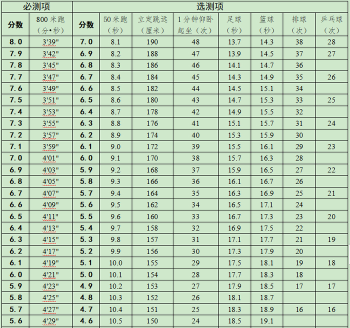 (五)在统一测试过程中,因突发伤病中途退出测试或因自身原因超过规定测试时间的考生,可不再继续参加该项测试。必测项目成绩按4分计算,选测项目成绩按3.5分计算。