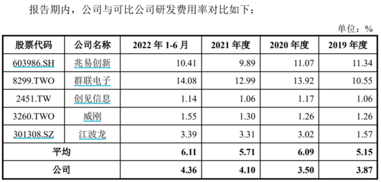 佰维存储报告期各期的研发费用率分别为3.87%、3.5%、4.1%、4.36%,相较于可比公司5.15%、6.09%、5.71%、6.11%的均值而言都差了不少,公司未来竞争力可能存在一定的问题。