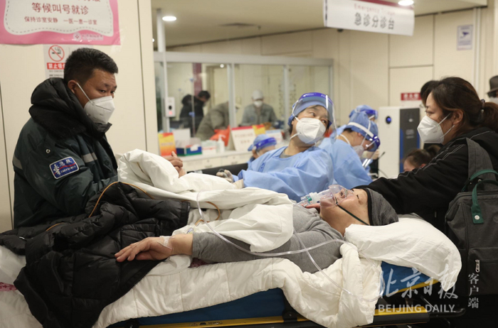 “近两周,急诊医学科持续高位运行,每日急诊内科患者增至450至550人次,以老年人、合并基础病的危重症患者为主,24小时进入急诊的救护车高达75至90车次。平时,我们的接诊量仅为100余人。”朝阳医院门诊办公室副主任张玉华介绍,急诊严格执行分级诊疗,经接诊医护评估后,病情危重、生命体征不稳定的患者第一时间送入抢救室开展相应治疗,生命体征相对平稳的患者会在医护人员的引导下排队候诊,“目前,医院的抢救室有16张固定床位,每日留下来的抢救患者有60人左右,急诊资源正在高位运转。急诊按照患者病情的严重程度开展诊治,优先救治病情危重的患者。生命体征平稳的部分患者就诊时有可能面临长时间的等待,希望患者予以理解。”