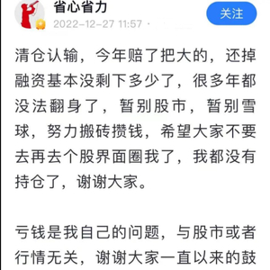 “省心省力”表示:“清仓认输,今年赔了把大的,还掉融资基本没剩下多少了,很多年都没法翻身了,暂别股市,努力搬砖攒钱,希望大家不要去再去个股界面圈我了,我都没有持仓了,谢谢大家。”