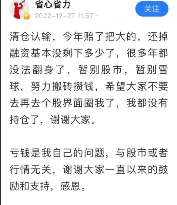 一位拥有30万粉丝的财经大V“省心省力”,在亏损几百万后,直接宣布清仓。发生了什么?
