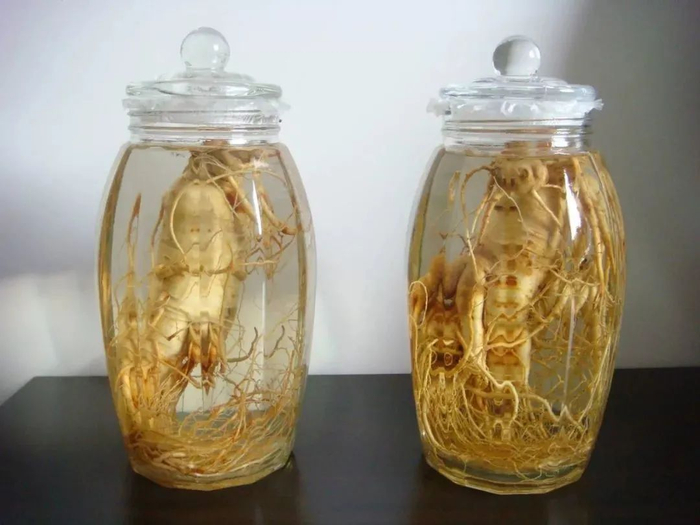 将鲜人参洗净后,整棵放入酒瓶,用50~60度白酒浸泡1月以上。邀三五好友小酌上一杯,神清气爽。