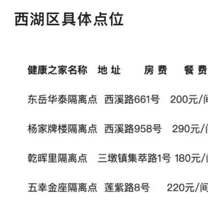 12月21日,杭州市举行疫情防控新闻发布会宣布,杭州已在各区县市储备建设75个“健康之家”,共16030间隔离用房,并按照住宿费不高于正常经营市场价、餐费不高于每人每天100元的标准执行。根据杭州市西湖区委区政府发布的健康之家相关信息,杭州市西湖区目前已开放东岳华泰隔离点、杨家牌楼隔离点等4个健康之家,房费加餐费整体在260元到300元一天。