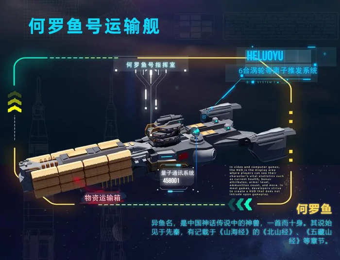 何罗鱼号运输舰为单突可往返太空与陆地的运输型空天舰。搭载6台涡轮等离子推发系统,使其既能在太空行进,又能在大气层飞行,能够为“未来太空城”建设提供大量的物资运输。