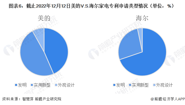 海尔和美的家电专利申请类型以发明专利为主。美的的专利中一半左右为发明专利,实用新型占比超44%;美的超过70%的专利为发明专利,实用新型占比约27%。