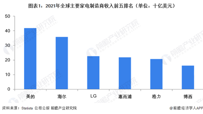 2021年全球主要家电制造商收入排名第一的是美的,家电营收约为421亿美元;其次为海尔和LG,家电营收分别为360亿美元和229亿美元;惠而浦公司、格力和博西家用电器集团紧随其后。