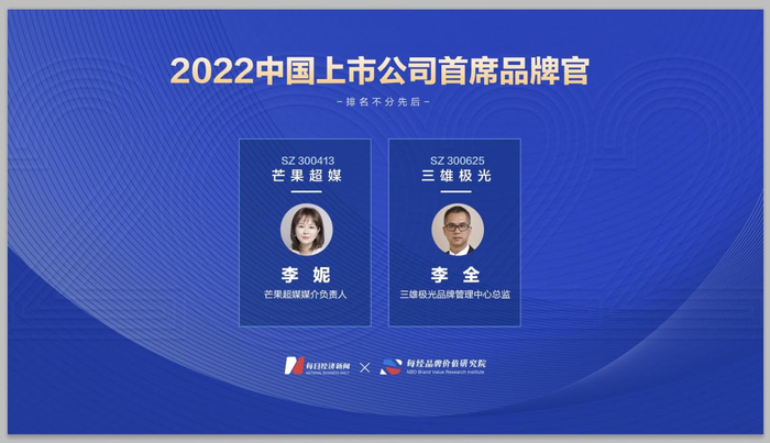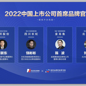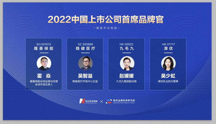 在此次公布的名单中,来自10家企业的10位品牌官荣获“2022中国上市公司首席品牌官”。他们分别是:洋河股份的张联东、四川长虹的饶彬彬、金龙鱼的陈波、北元集团的刘国强、隆基绿能的霍焱、稳健医疗的吴智溢、九毛九的赵媛媛、澳优的吴少虹、芒果超媒的李妮、三雄极光的李全。