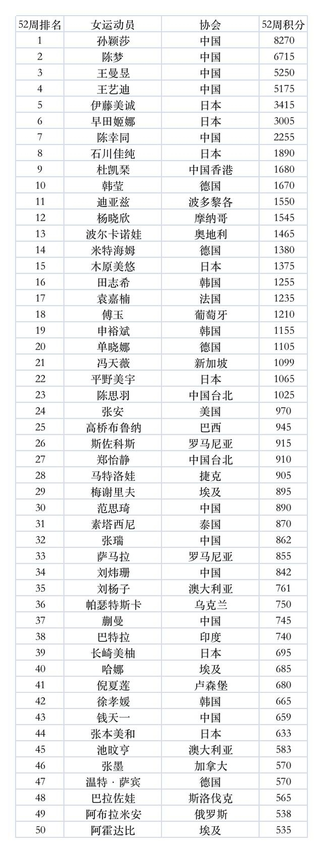 女单方面,中国队显现出了更大的优势,女队的孙颖莎、陈梦、王曼昱和王艺迪稳居前4,陈幸同为例第7。她们的积分分别是8270分、6715分、5250分、5175分和2255分位列第7。中国队最大的竞争对手日本选手伊藤美诚以3415分排名第5。