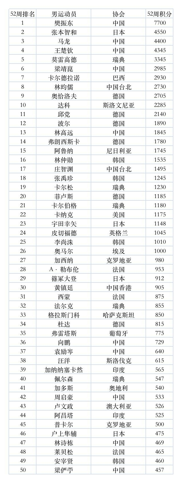 国际乒联公布是第52周世界排名,也是今年的最后一期。男单方面,樊振东、张本智和、马龙、王楚钦位居前4,梁靖崑第6,林高远第13。樊振东的优势之大,积分是7700分,比排名第二的张本智和高出了三千多分,张本智和是4550分。张本智和、马龙和王楚钦的积分非常接近,马龙仅比张本智和少了150分。