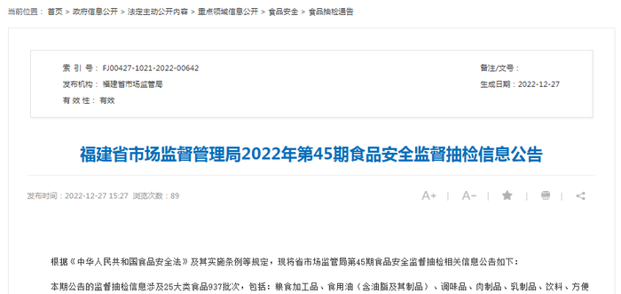 | PJ22350000002947684 | 91 | 河南康元粮油食品加工有限公司 | 河南省南阳市光武西路939号 | 长泰县兴泰新丰原超市 | 福建 | 特一小麦粉 | 1kg/袋 | 2022/6/7 | 粮食加工品 | 第45期 | 2022.12.27 | 福建/国抽 | |