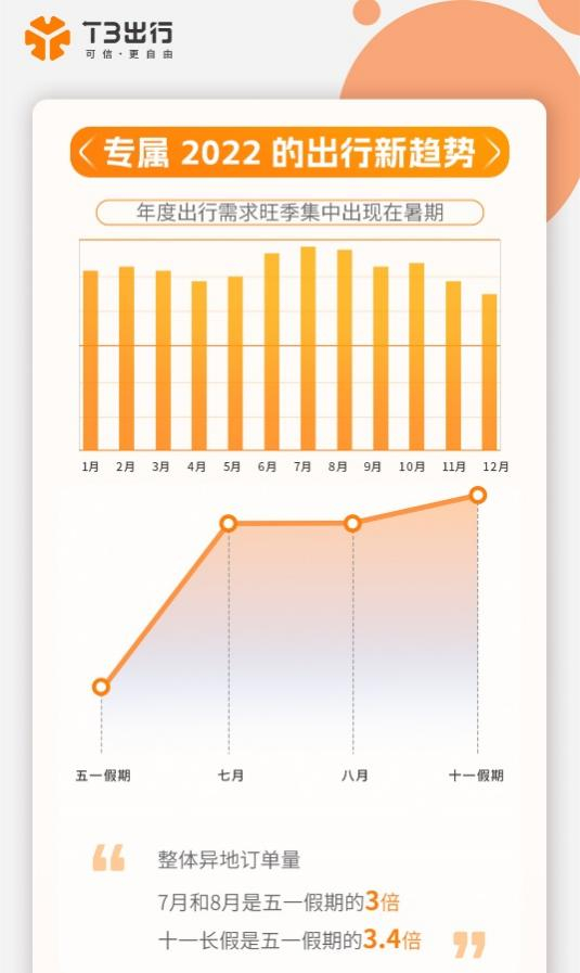 外出旅游、探亲等是人们暑期出行的主要需求。从用户在异地城市呼叫T3出行的情况来看,7月和8月乘客整体异地订单量是五一假期的3倍。另外,十一长假期间,异地出行订单亦创下新高,是五一假期的3.4倍。