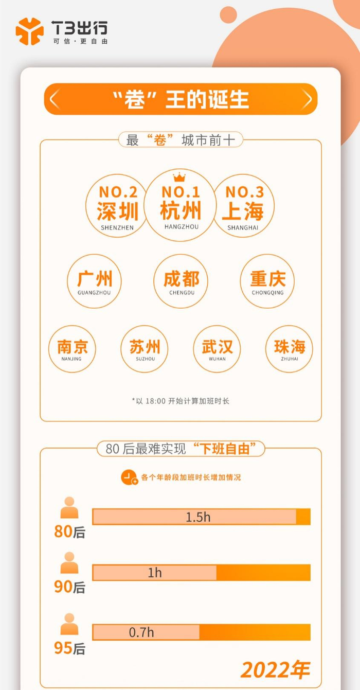 根据《报告》统计,以18:00开始计算加班时长,杭州是最“卷”的城市,每天平均下班时间相比2021年晚了1小时,深圳、上海、广州、成都、重庆、南京、苏州、武汉、珠海紧随其后,位列最“卷”城市排行榜第二至第十位。