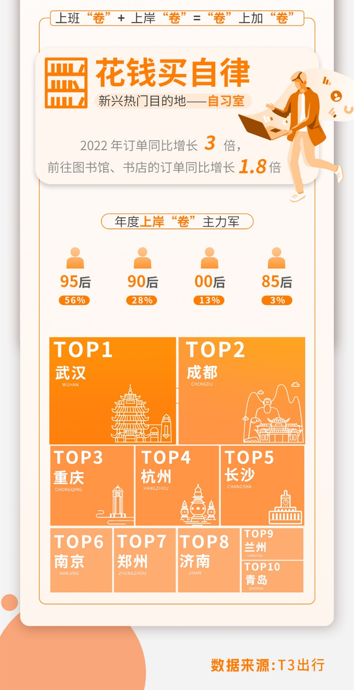 12月28日,T3出行发布《2022年度出行消费报告》(下称“报告”),对2022年度用户的出行消费特点进行盘点。《报告》显示,53%的用户打车频次同比增加,上下班通勤超越休闲娱乐成为首要打车需求。95后等年轻群体则热衷前往收费自习室、图书馆等场所备考,令前往自习室的订单同比增幅达300%。
