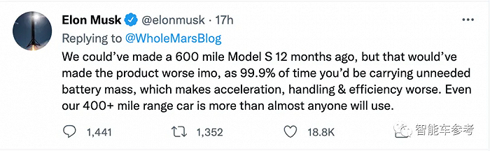 马斯克曾在年初表示,续航超过600英里(1000公里)的电动车,特斯拉一年前就能造,但“没有任何意义”。他认为超过400英里(643公里)的续航,在99.9%的场景下用户都用不到。相反,它还会带来更大的电池包,影响车辆的操控。