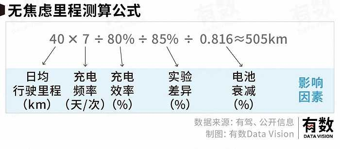 如下图,将各自实际情况带入即可,例如,期望做到周充的上班族,假设平均每天行驶40km,买辆505km续航的车就能做到没有用电焦虑;如果平均每天行驶50km,那得买一辆630km的。