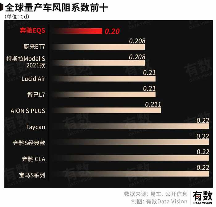 目前,全球风阻系数最低的是奔驰的EQS,风阻系数仅为0.20Cd。