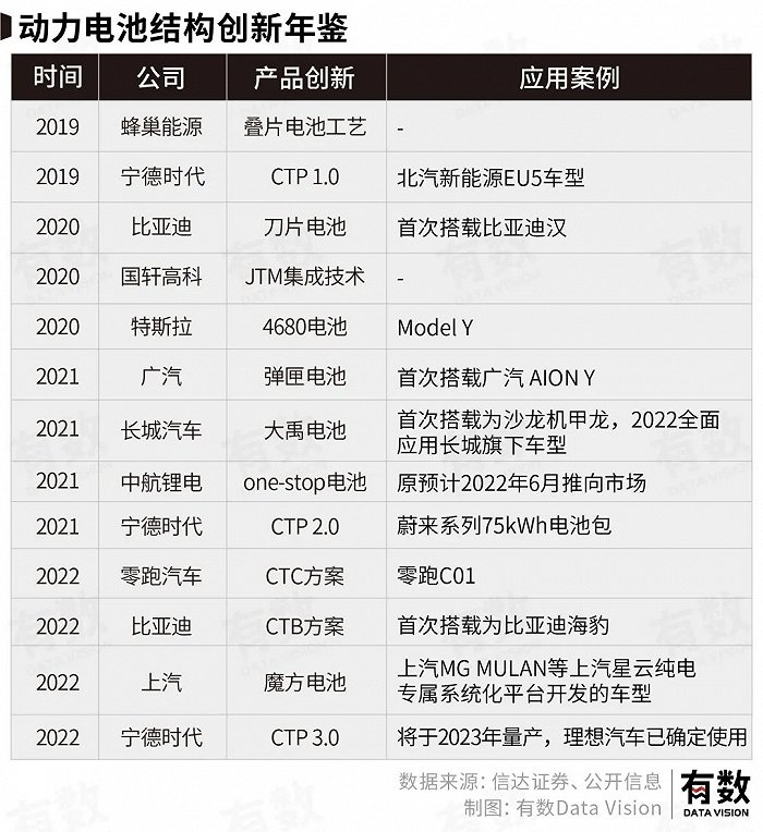 另一方面,磷酸铁锂在安全性上更胜一筹,这意味着在电池结构上有更多做“减法”的可能性。比如比亚迪的刀片电池把电池包内体积利用率提高了50%,可以放入更多电芯,在占用空间不变的前提下尽可能的提升了能量密度。