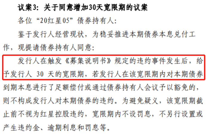 另外,“20红星05”债券还设30天宽限期条款,触发债券违约条款后给予30天宽限期,宽限期内不设罚息。
