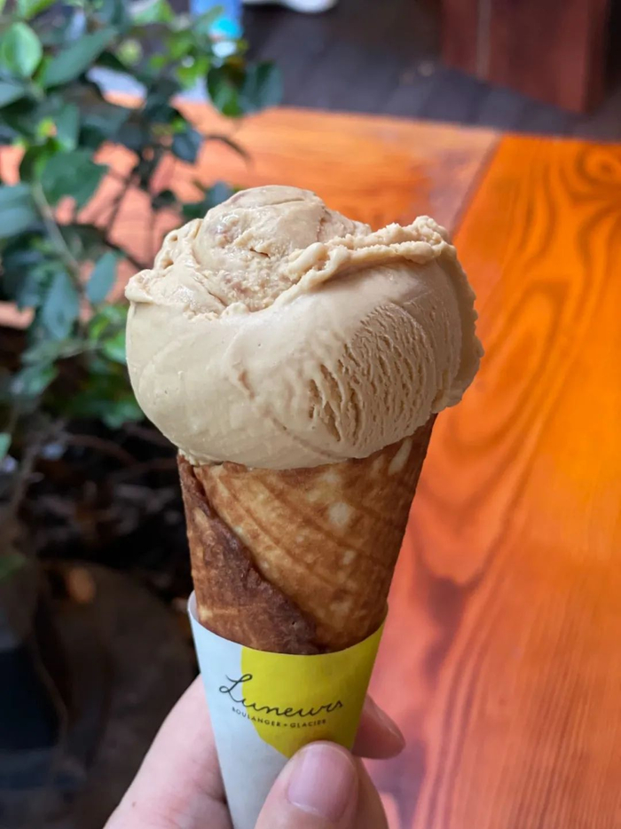 几年前,上海有一家非常火的法式面包店,火到常常有大巴车拉人来吃面包。但没过多久,因为同行的卧底举报,这家店被迫停业。员工因此四散,老板跑回了巴黎,开了新的甜品店,做面包的日本师傅自己开了家面包小店,而冰淇淋师傅则和几个人一起创立了一个连锁品牌,后来,那个品牌的冰淇淋风靡上海,就是我们正在吃的这款,Chris说,「这个故事像不像中国人说的,凤凰,遇到了火……」