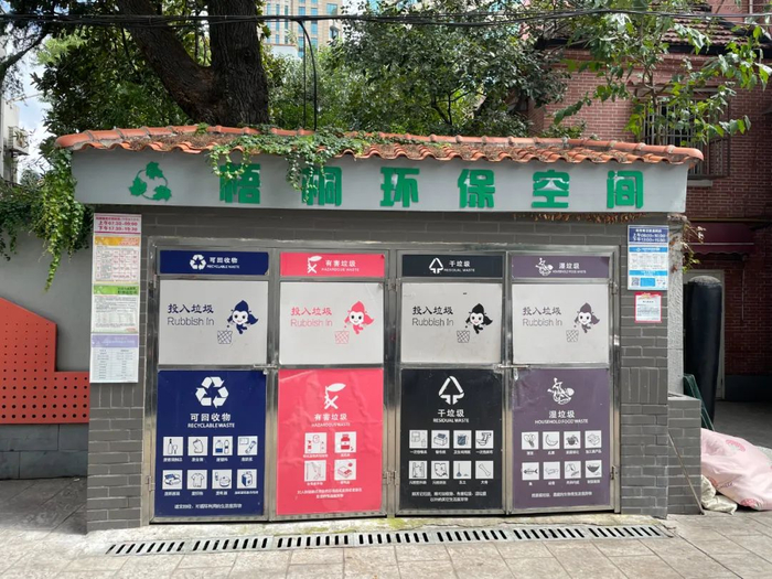 离开Chris在上海的第二个住所,没走几步,我们看到了一个垃圾站,那是一个新式的垃圾站,每一个垃圾桶上面写着自己的功能:干垃圾、湿垃圾、有害垃圾、可回收物。但在垃圾分类开展之前,那是一个记载着Chris生活的垃圾站。