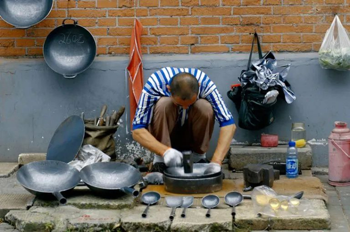 那是2006年,Chris刚来上海一年不到,闲逛时遇到两位铁锅匠,姓岑,是两兄弟。岑氏兄弟纯手工打造铁锅的过程令Chris着迷,于是,他每年都会去找兄弟俩聊天。一开始,这两兄弟完全不想理他,慢慢熟悉后,才变得愿意多说两句。Chris想知道上海是否还有别的铁锅匠,但每一次,他得到的答案都是「No」,直到十年后,答案才有所变化,「我已经认识他们10年了,每次问他们还有别人做这个吗,他们都说,no,no,no,10年过去,他们才告诉我, 确实还有一个。」