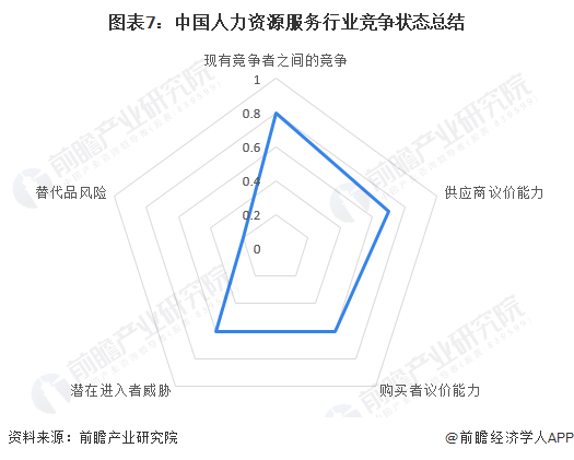 根据以上分析,对各方面的竞争情况进行量化,1代表最大,0代表最小,目前我国人力资源服务行业五力竞争总结如下: