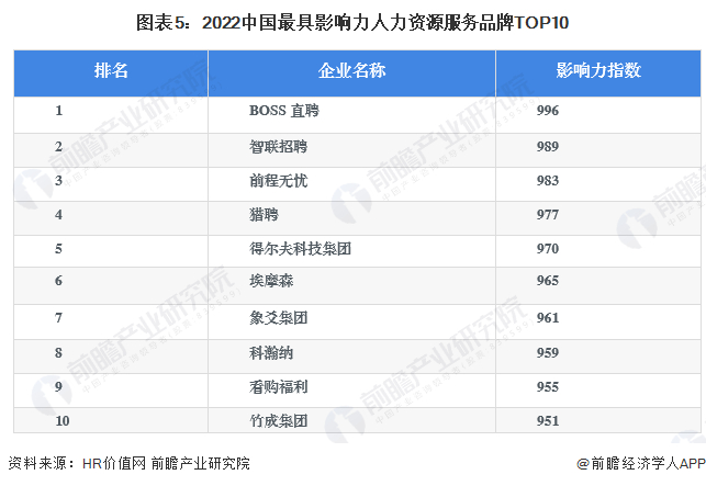 2022年5月20日,HR价值网发布“2022中国最具影响力人力资源服务品牌50强”榜单,位列榜单前三位的品牌分别是BOSS直聘、智联招聘、前程无忧。