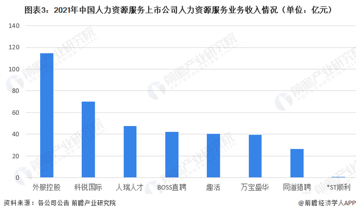 2021年中国人力资源服务上市企业中人力资源服务相关业务营收规模最高的是外服控股,营收超110亿元;科锐国际营收超70亿元,排名第二;人瑞人才和BOSS直聘的人力资源服务营收超40亿元,位列第三和第四。