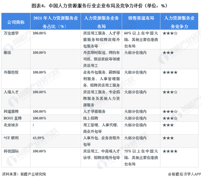 外服控股、科锐国际等人力资源企业专注于人力资源服务,且营收规模领先,也在积极布局境外业务,竞争实力较强。万宝盛华等外资人力资源服务企业经验丰富,业务布局较广,重点布局灵活用工、人才寻猎等发展潜力较大的细分领域,竞争实力也不容小觑。