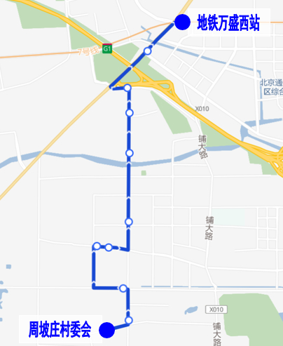 沿途设站:周坡庄村委会、外郎营村、北京国际图书城南站、胡家垡、北京国际图书城、铺外四路、口子村东、朱家垡北一路西口、铺外路北口、铺头村路口、万盛南街西口(开往周坡庄村委会方向)、地铁万盛西站。