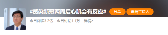 近日,关于#感染新冠两周后心肌会有反应#的相关话题引发公众关注,阅读量达3.2亿,登上微博热搜榜第一位。