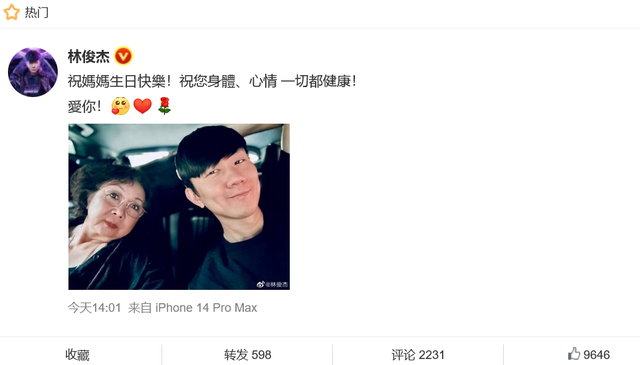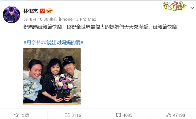 不仅如此,每年的母亲节,林俊杰也会晒出合照为妈妈送祝福,十分用心。