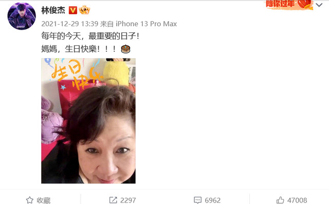 12月29日中午,歌手林俊杰晒出和妈妈的合影为她庆生。