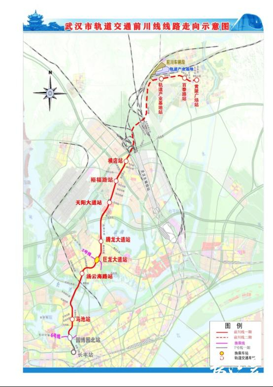 前川线工程(一期)全长21.1公里,起于7号线园博园北站,沿环湖中路、盘龙大道、川龙大道等主干道走行,设马池站、汤云海路站、巨龙大道站、腾龙大道站、天阳大道站、裕福路站、横店站共7座车站。前川线一期与7号线贯通运营后,全线成为连接北部新城组群、汉口中心城区、武昌中心城区、南部新城组群的市域快线,成为一条重要的客运交通走廊。