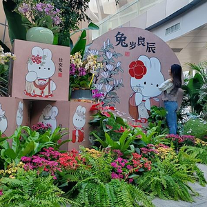 本次花展以“婷婷‘芋’立展娇容 前‘兔’似锦喜迎春 ”为主题,共展示特色花卉40余种、约2000余株,包括网红植物萨利安海芋、斑马海芋、大仙女海芋、绿天鹅绒海芋、内罗毕海芋、牛奶纸屑合果芋等,并制作了多个可爱俏皮的卡通兔,或身披红色斗篷、或头戴红帽子、或手提红灯笼,营造出兔年迎新春的热闹景象。在“海芋之恋”展示区,各种芋类植物巨大的叶片五彩斑斓,叶脉清晰,独具特色的茎干也富有趣味性和观赏性,如斑马海芋的茎干似有斑马纹路,内罗毕海芋的茎干呈粉红色。工作人员还精心采用蝴蝶兰、绣球进行点缀,还原附生现象,营造出花叶奇美的雨林景观。