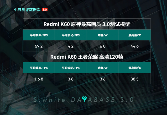 Redmi K60游戏表现:骁龙8+ 3.0GHz版,原神最高画质,平均帧率59.2帧,功耗6.0W,机身温度最高44.6℃;王者荣耀120帧+高清画质,平均帧率116.8帧,功耗3.6W,机身最高38.5℃;