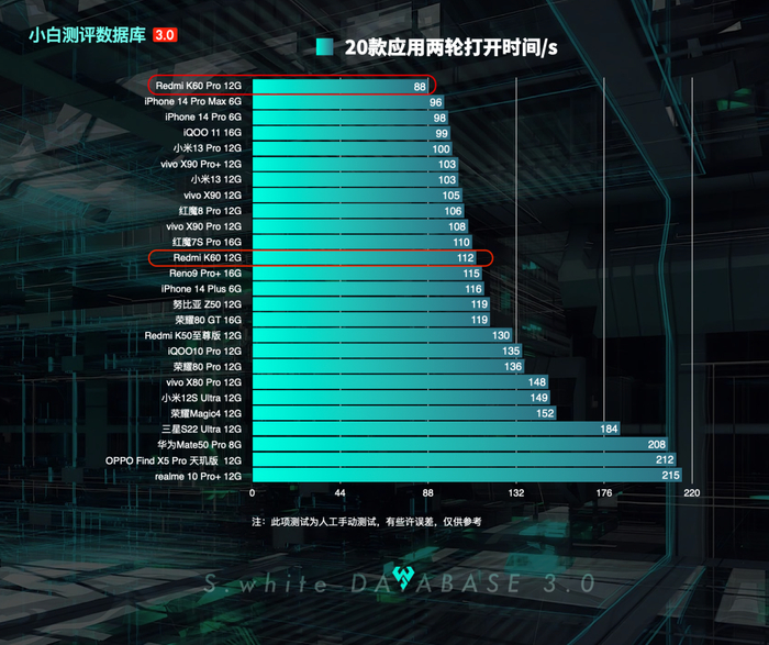 性能综合表现上,Redmi K60实测20款应用两轮打开时间为112秒;Redmi K60 Pro则20款应用两轮打开用时88秒;
