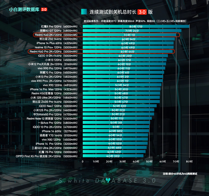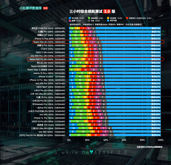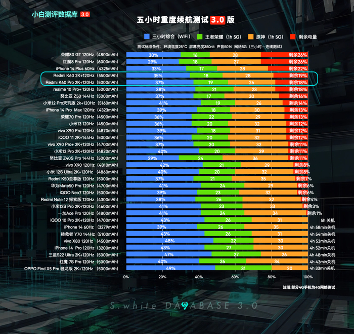 Redmi K60续航实测:2K+120Hz 5500mAh电池,三小时综合续航模型测试电量剩余65%,五小时重度续航剩余19%,连续测试到关机总用时7小时1分钟;(*配图榜单仅代表目前小白测评数据库3.0模型下已测试机型的排行,不代表机圈所有手机排行)