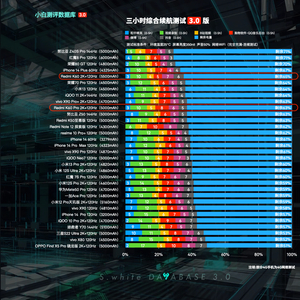 Redmi K60 Pro续航实测:2K+120Hz,5000mAh电池,三小时综合续航模型测试电量剩余63%,五小时重度续航剩余18%,连续测试到关机总用时6小时44分钟;测试过程中没有降亮度,也没有降体验。(*配图榜单仅代表目前小白测评数据库3.0模型下已测试机型的排行,不代表机圈所有手机排行)