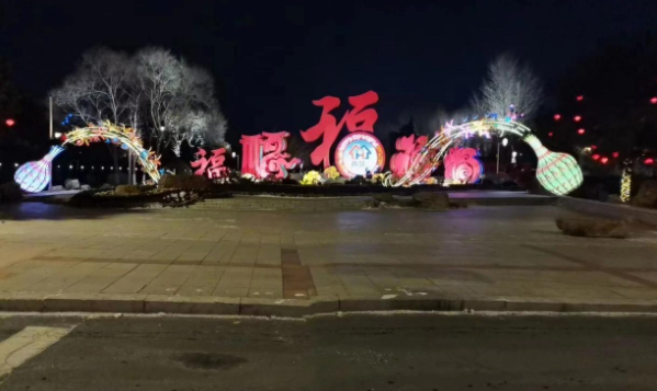 远看好似充满中国风的大红拱门,映红夜空;“福”字加上兔年生肖霓虹灯,让市民感受扑面而来的是浓浓的节日喜感。