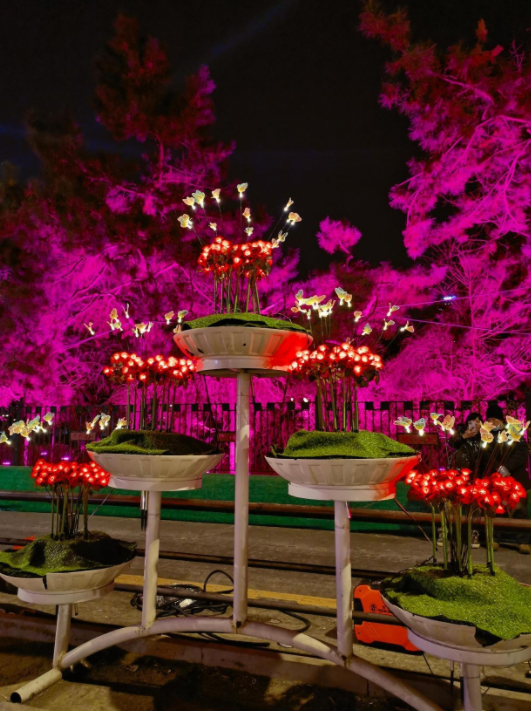公园东门两侧花坛插装红色康乃馨并配上灯光蝴蝶,盛世花开,蝶伴花飞,春回大地,生机盎然。
