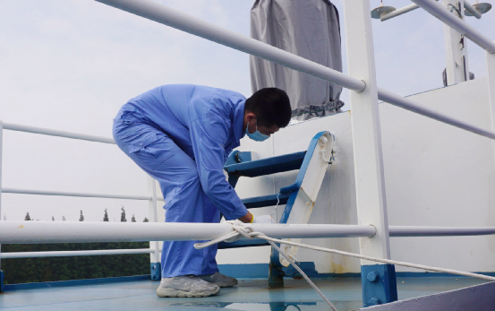 水手们在甲板进行油漆作业(摄影:邓茗)
