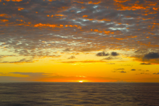 傍晚,火烧云燃烧了整个天空,倒映着海面上“火焰山”似的一片。整个船上最热闹的也就是这个时候。
