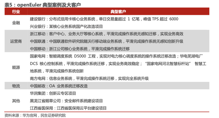 民生证券11月23日研报认为,结合华为自研的鲲鹏芯片以及openGuass开源数据库系统,openEuler操作系统能够有效支持华为全国产化数字底座,当前在金融、运营商等领域,openEuler已经拥有大量成功案例和大客户。亦有市场人士认为,欧拉正在成为各行业数字化转型的首选,也正在成为中国数字基础设施坚实的软件底座。
