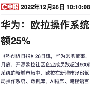 财联社12月29日讯(编辑 俞琪)华为常务董事、ICT基础设施业务管理委员会主任汪涛表示,截至2022年12月底,开源欧拉社区企业成员数超过600家,商业累计装机部署数量达到300万套,在中国服务器操作系统的新增市场中,欧拉在新增市场份额达到25%。