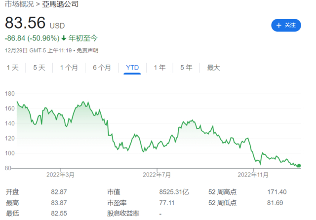 亚马逊的市值已从年初的1.7万亿美元缩水至不足8300亿美元。 该公司上个月跌出万亿美元俱乐部。