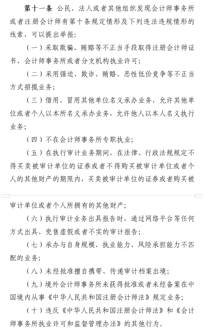 第十一条 公民、法人或者其他组织发现会计师事务所或者注册会计师有第十条规定情形及下列违法违规情形的线索,可以提出举报: