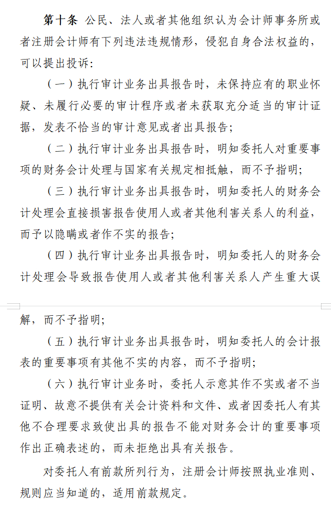 第十条 公民、法人或者其他组织认为会计师事务所或者注册会计师有下列违法违规情形,侵犯自身合法权益的,可以提出投诉: